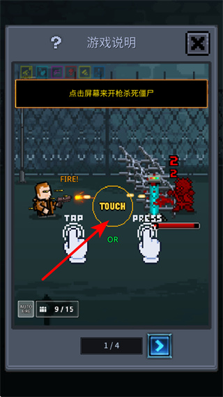 1、进入游戏后,点击屏幕区域开启射击,这是消灭僵尸敌人的核心操作,通过点击可快速启动攻击流程,清理丧尸。
