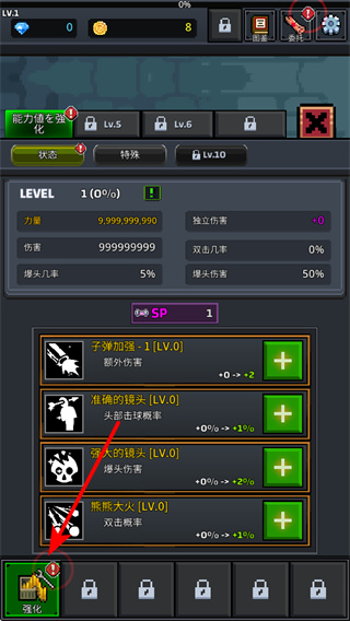 3、点击强化按钮进入能力升级界面,利用SP状态点升级子弹加准确的爆头等技能,可大幅提升攻击伤害与效率。