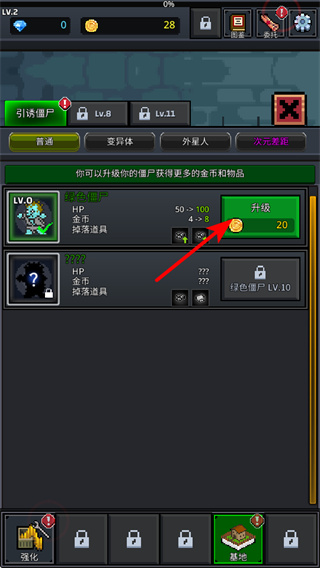 1、在游戏中,点击升级按钮提升僵尸属性,升级僵尸可获取更多金币和稀有道具,是积累资源、强化自身的重要途径。