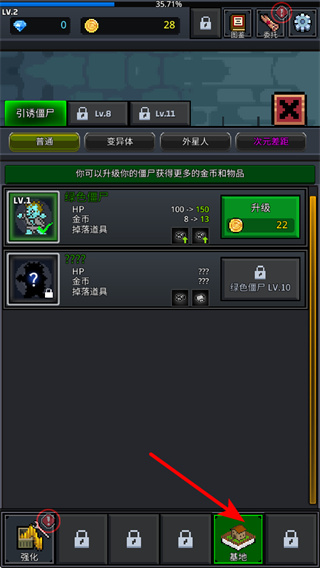 2、点基地按钮,可进入基地界面管理僵尸升级等操作,基地是资源管理和战力规划的核心区域,利用可优化游戏发展。