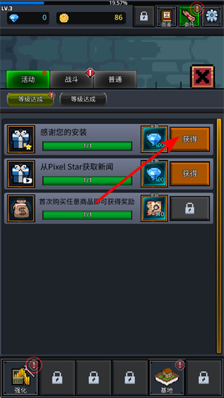 4、点击获得按钮领取钻石奖励,钻石是稀缺资源,可用于解锁特殊功能或加速发展,及时领取可助力游戏进程。