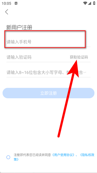 3、在新用户注册页面,输入手机号,点击获取验证码。