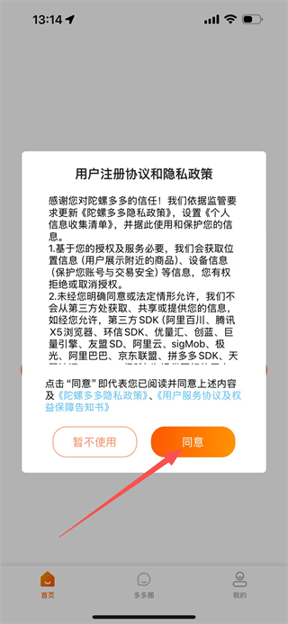 1、在用户注册协议和隐私政策弹窗中,点击同意,进入首页。