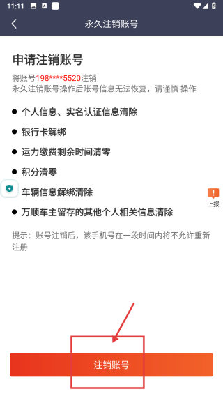 4、在永久注销账号页面,点击注销账号按钮,即可发起账号注销操作。