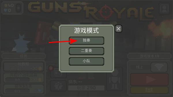 2、选择独奏游戏模式,独奏模式是单人作战的玩法,选择后可专注于自身发育和战斗,提升吃鸡概率。
