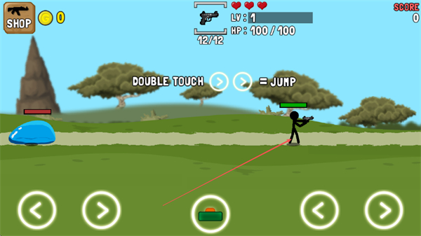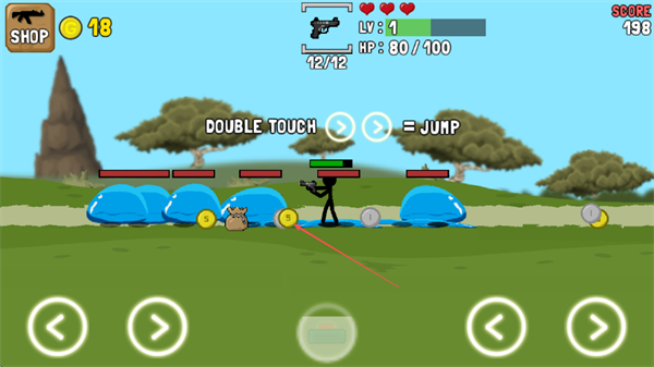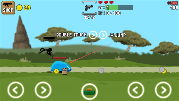 1、操控火柴人移动,双击左右方向键可跳跃,攻击蓝色敌人,收集金币。