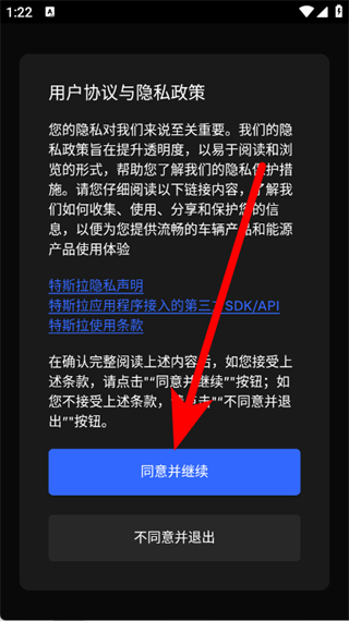 1、打开特斯拉,在弹窗中点击同意并继续,进入登录选择页面。