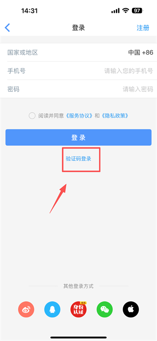 3、在登录界面,点击验证码登录选项,切换至验证码登录页面。