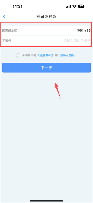 4、在验证码登录页面,填写手机号并勾选协议后,点击下一步按钮,完成账号登录。