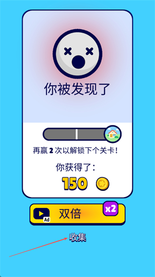 4、若被发现,会显示你被发现了,可领取金币奖励,点击收集继续游戏,再赢2次可解锁下一关。