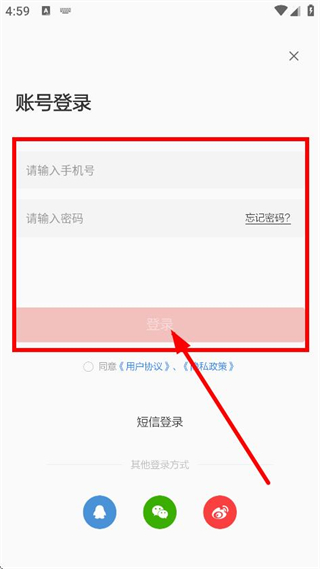 4、输入手机号、密码,点击登录,完成账号登录的操作。