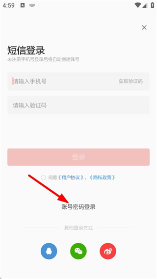 3、在登录页面,点击账号密码登录,切换到账号登录页面。