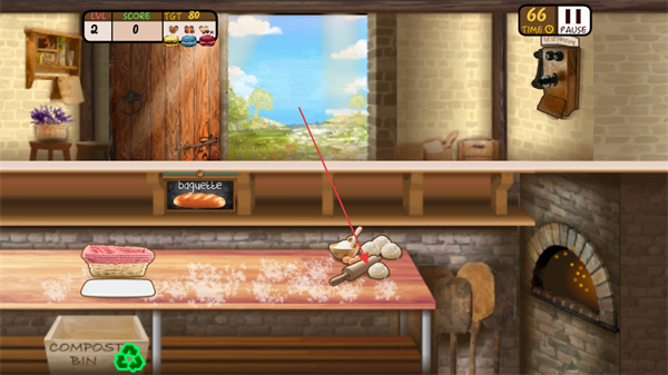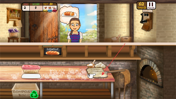 2、进入餐厅后,在顾客还未来之前先进行面包的制作,点击擀面杖进行面包的制作。