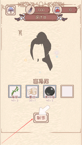 2、在设计台选择材料如藤蔓、蕾丝、黑珐琅,点击制作,生成服饰部件如高马尾。