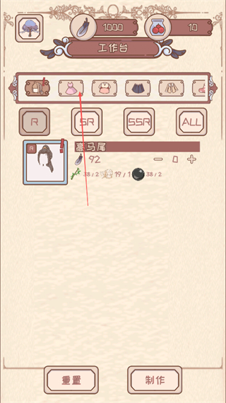 4、在工作台选择服饰类型如SR级,搭配制作好的部件如高马尾,点击制作,完成服饰制作。