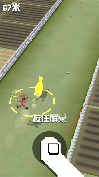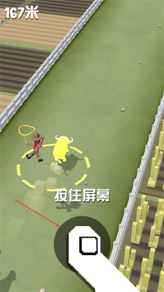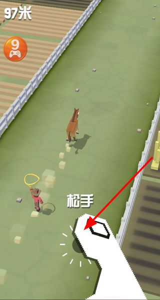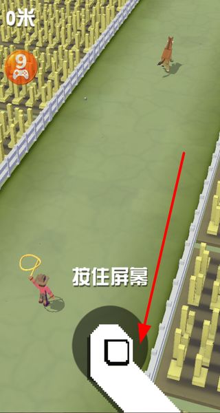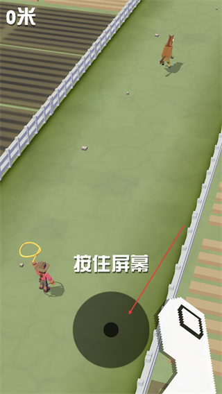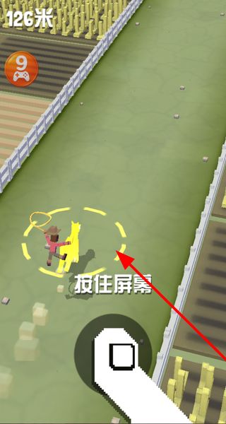 1、按住屏幕控制牛仔移动,在跑道上追赶动物,把握时机,为套索动物做准备,推进游戏的捕捉进程。