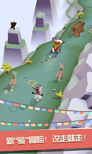 3、骑乘当前动物时,保持按住操作区域,当遇到更高级动物时,套索会自动尝试捕捉,成功后会切换骑乘对象,同时前进距离会持续累积。