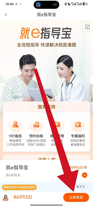 4、在服务详情页面,点击立即购买,完成该挂号协助服务的购买,进而推进挂号预约。