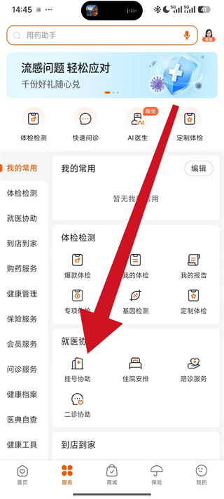 2、在服务页面中,找到就医协助板块下的挂号协助,点击进入挂号协助页面。