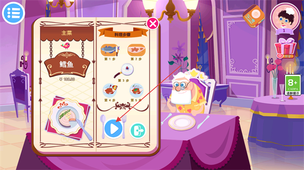 3、这是料理任务的步骤指引界面,当前展示主菜鳕鱼的料理步骤,点击界面内的开始按钮,即可按照指引步骤完成鳕鱼料理的制作。