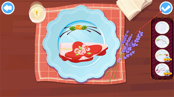 4、这是料理完成后的摆盘界面,完成菜品摆盘操作后,点击界面右上角的确认按钮,即可提交该菜品。