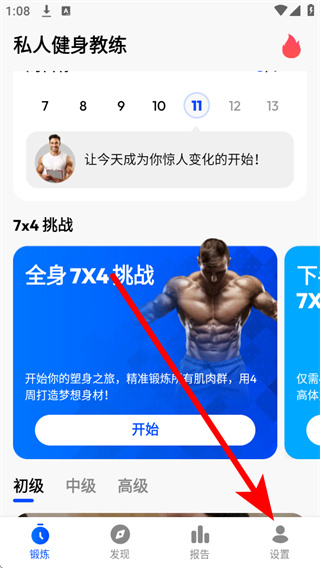 1、打开私人健身教练,点击底部导航栏的设置,进入设置页面。