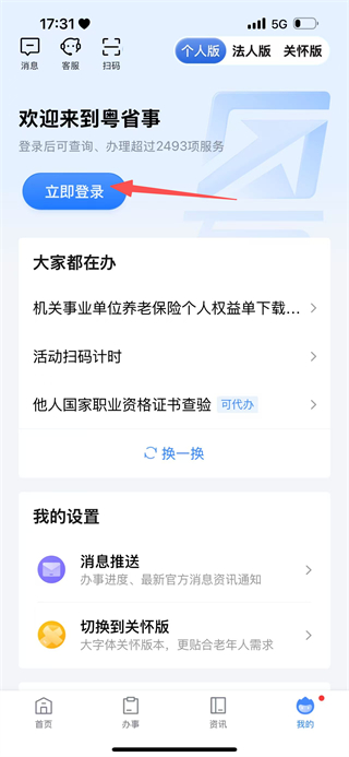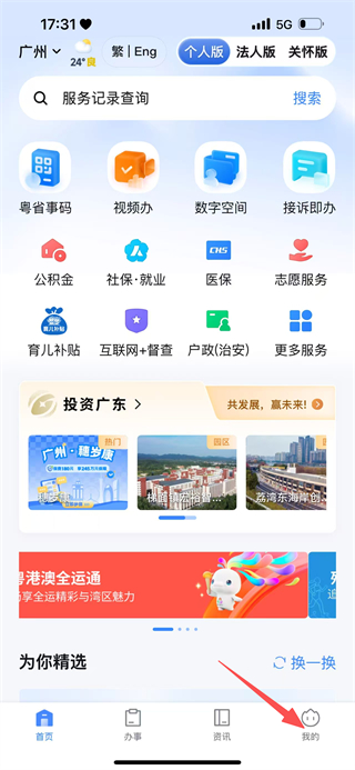 1、在粤省事首页,点击底部的我的选项,进入个人页面。