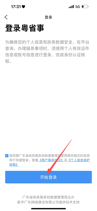 3、在登录准备页面,点击开始登录,进入广东政务服务登录选择页面。