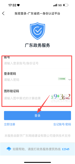 5、在账号密码登录界面,填写账号/身份证、密码,图形验证码,点击登录,完成账号登录。