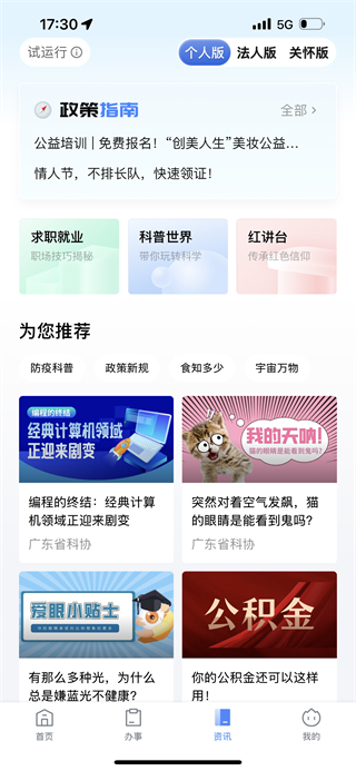 粤省事是广东全省通用的移动政务服务平台,为全省市民提供便捷高效的掌上政务办理渠道,既切实方便百姓群众日常生活,又有效提升政府办事效率,新版新增“团体码”“个人数字空间”“关怀版”等亮点功能,进一步优化服务体验,成为覆盖全省、便捷实用的政务服务核心载体。