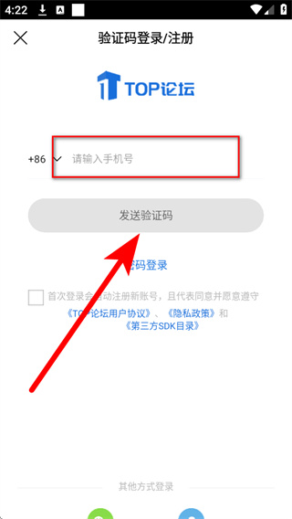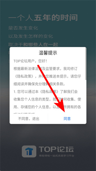 1、打开TOP论坛,在弹窗中点击同意,进入应用首页。