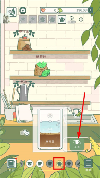 2、点击底部的茶壶类功能按钮,进入食材准备界面,选取订单所需的鲜茶叶、热水等材料,通过工艺操作将材料组合,完成对应茶饮的制作。