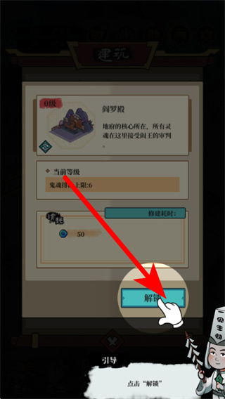 3、在阎罗殿详情页,点击解锁按钮,消耗对应资源解锁这个地府核心建筑。