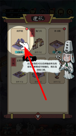 2、在建筑界面中,选择可解锁的阎罗殿建筑,进入该建筑的详情页面。