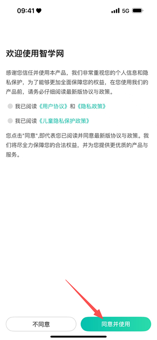 1、在智学网的协议页面,点击同意并使用按钮,进入登录页面。