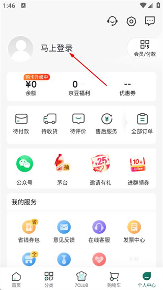 2、在个人中心页面,点击马上登录区域,进入登录选择页面。
