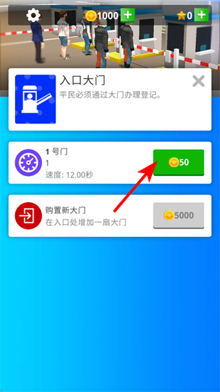 1、进入游戏界面后,点击1号门对应的金币按钮,消耗50金币升级大门效率,这是提升登记速度的关键操作,按提示消耗资源即可。