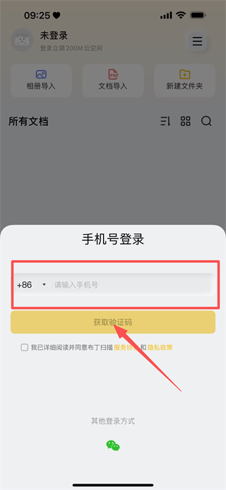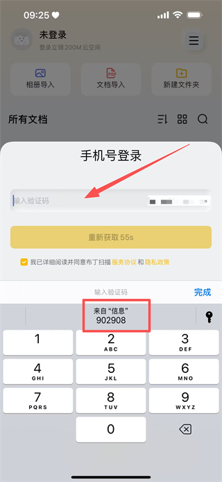 4、在验证码输入页面,填写收到的验证码,完成布丁扫描的账号登录。