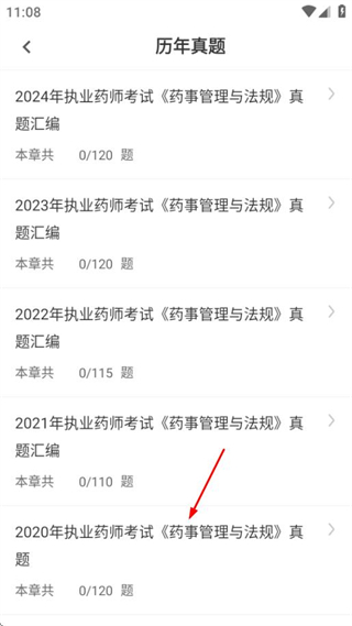 1、在执业药师智题库首页,点击历年真题选项,进入真题年份列表页面。