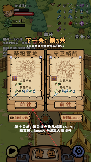 1、选择祭祀营地点击前往,进入关卡3,推进游戏进程。