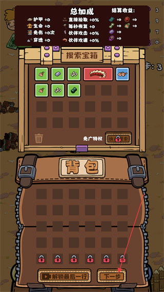 4、打开搜索箱获取道具,查看总加成后点击下一步推进。