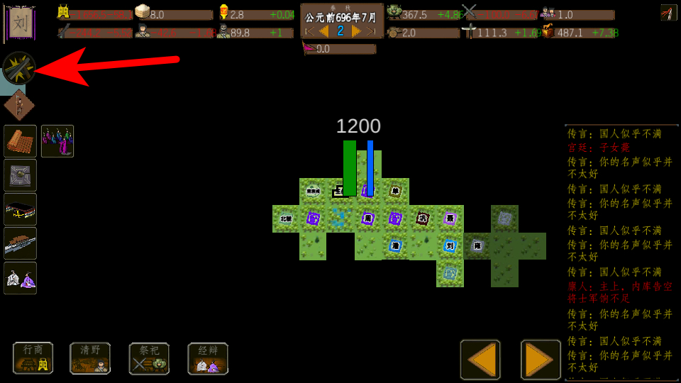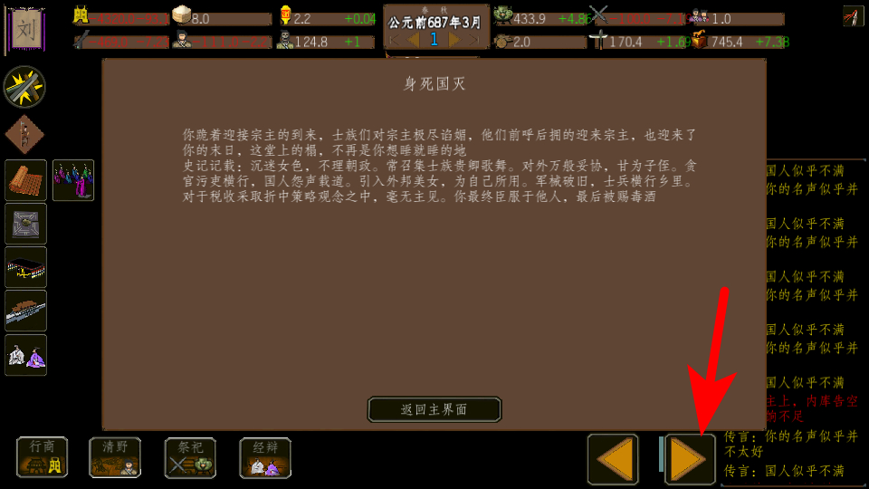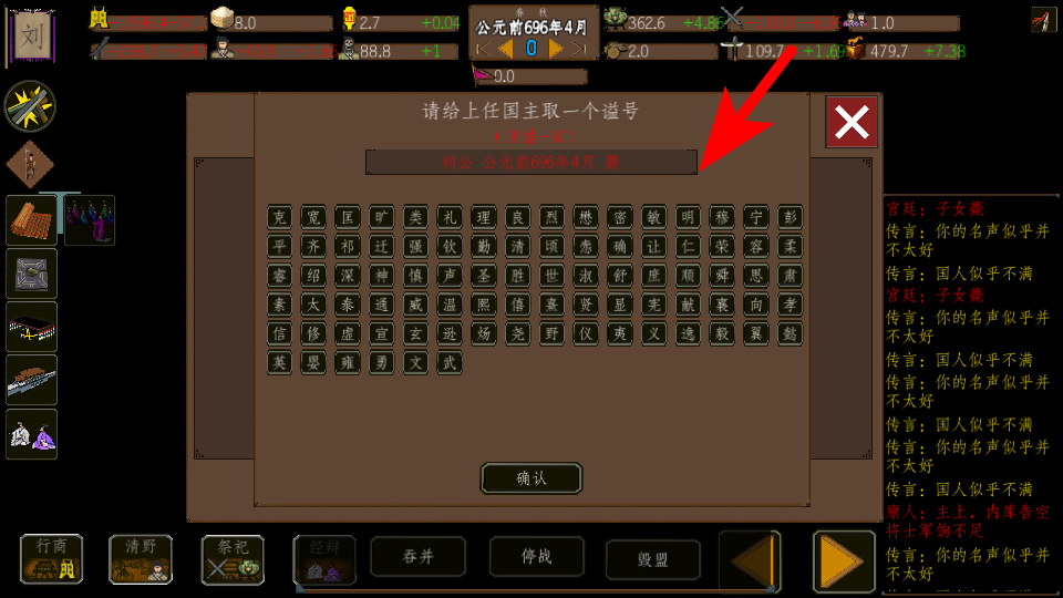 1、进入游戏后,点击箭头指引的谥号文字区域,这是确定前任国主称号的关键操作,选择文字后即可推进流程。