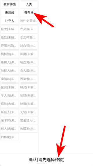 1、进入游戏后,点击箭头指引的种族选项,这是选定游玩种族的关键操作,选择后才能解锁后续确认流程。