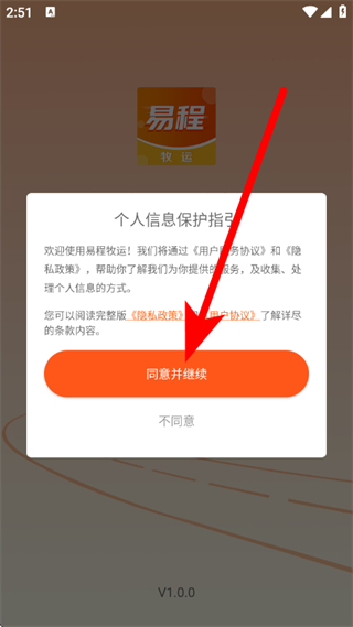 1、打开易程牧运,弹出提示框,点击同意并继续,进入首页。