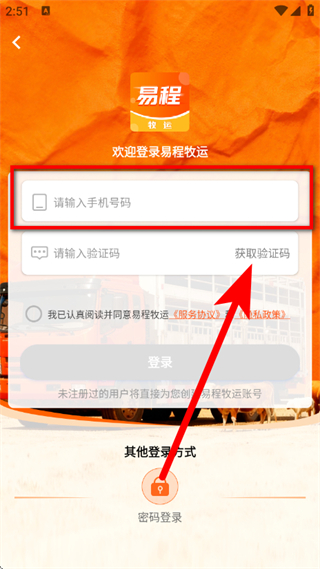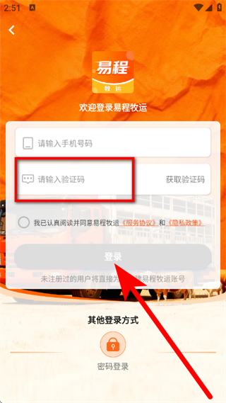 2、在首页,点击底部我的,进入欢迎登录易程牧运的登录页面。