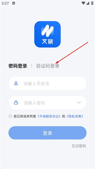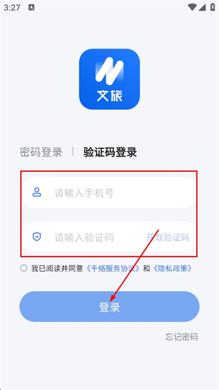 1、在千络文旅APP的入驻协议与隐私政策弹窗中,点击同意,进入登录页面。