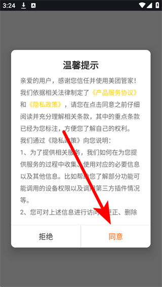1、打开美团管家,在弹窗中点击同意,进入登录页面。