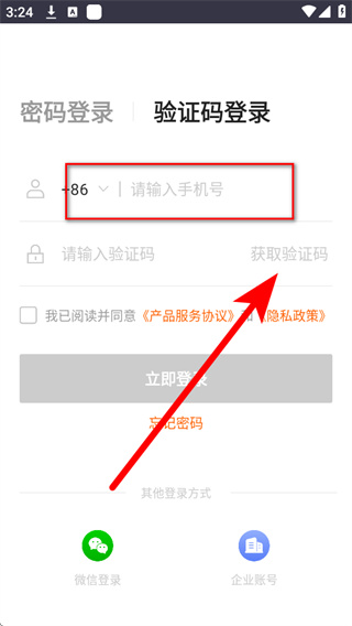 3、在验证码登录界面,先在手机号框填写手机号,获取短信验证码。
