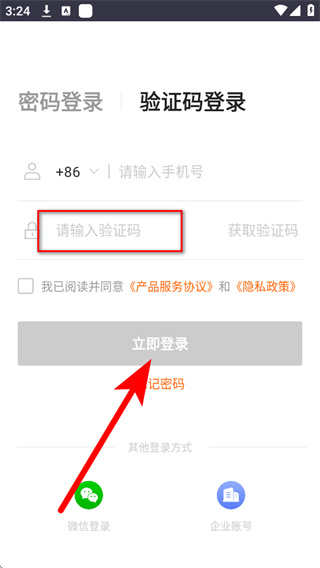 4、将收到的验证码填入验证码框,勾选相关协议后,点击立即登录完成账号登录。