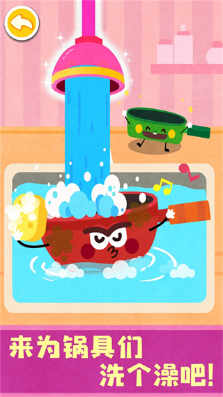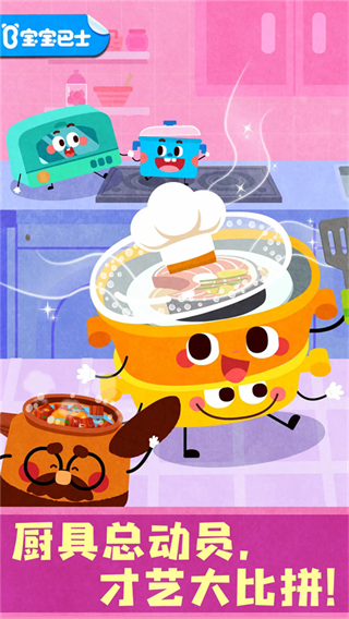 宝宝神奇厨房是宝宝巴士打造的一款专为儿童设计的厨房模拟益智佳作,用生动动画赋予厨具鲜活生命,让锅碗瓢盆化身身怀绝技的小厨师,在充满童趣的厨房中开启热闹的食神争霸赛,孩子们可以主动与这些可爱的厨具互动,认真聆听它们的自我介绍,了解每样厨具的独特功能,还能和厨具伙伴们携手合作,一步步完成美食的制作。